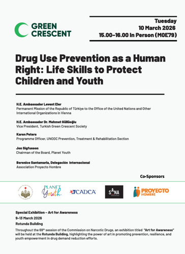 Our Country Green Crescents will host and contribute to several side events highlighting prevention, treatment, and policy solutions for substance use among youth and communities worldwide. You can find below the sessions you can join both in person or online, featuring the participation of IFGC Members including Conectados Pela Vida, Green Crescent Health Development Initiative, Green Crescent Colombia, Green Crescent Indonesia, Green Crescent Society, Green Crescent Uruguay, Green Crescent Malaysia, Green Crescent Zimbabwe, , Madinaty, Jordan Anti-Drugs Society, Public Association Against Harmful Habits Azerbaijan, Stardom Association, Turkish Green Crescent Society, and Caşıl Ay Koomu: