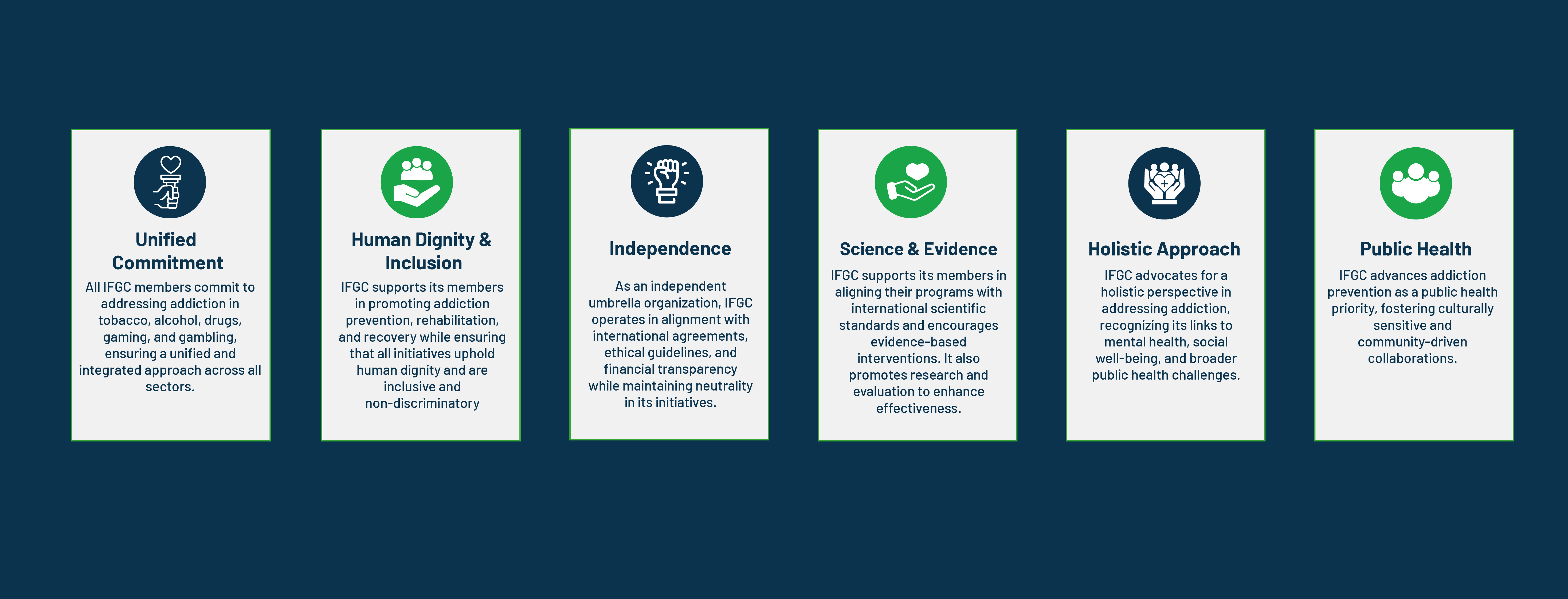 Through these six interconnected principles, IFGC ensures that its strategy is both comprehensive and adaptable, empowering members worldwide to develop sustainable, inclusive, and scientifically sound solutions to the challenges of addiction.